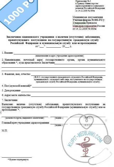 Медицинская справка 001 гсу для поступления на государственную службу действует на протяжении одного года. Выдается справка только при отсутствии у претендента на вакантное место следующих патологий: