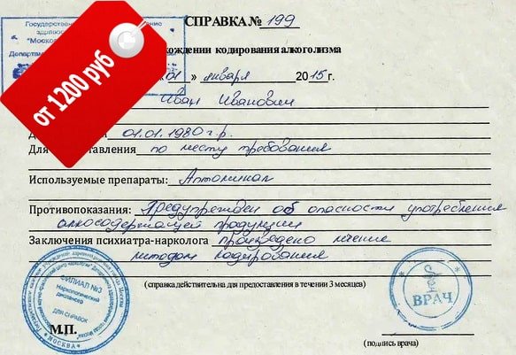 Подтвердить отсутствие проблем с алкоголем поможет официальная медицинская справка о кодировании. Данный медицинская справка будет оформлен быстро и с гарантией качества. Вам даже не придется проходить процедуру кодирования, если сразу обратиться в наш профессиональный центр.