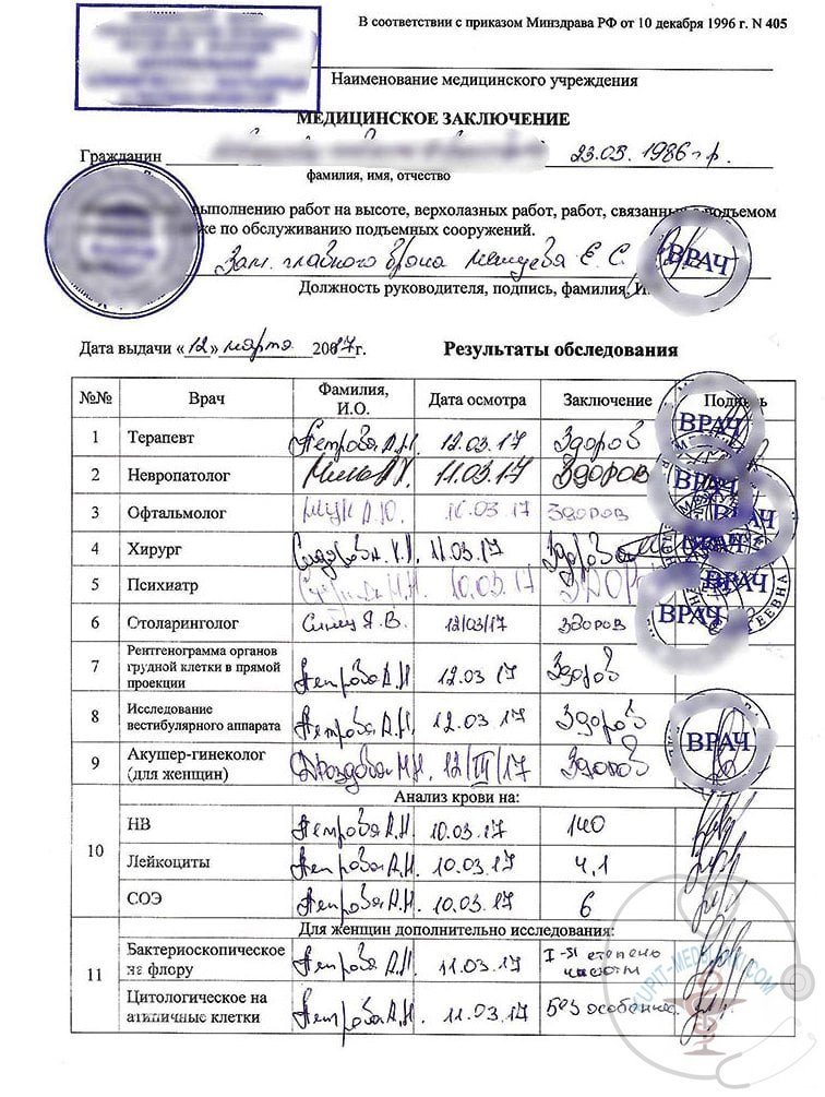 Справка 405 для работы на высоте купить в Москве