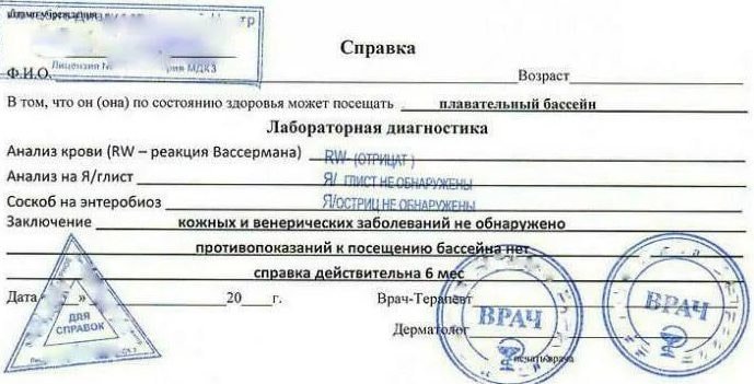 Согласно санитарным нормам, все желающие посетить бассейн обязаны иметь справку о состоянии здоровья. Врач выдаёт её после проведения осмотра и, при необходимости, анализов.